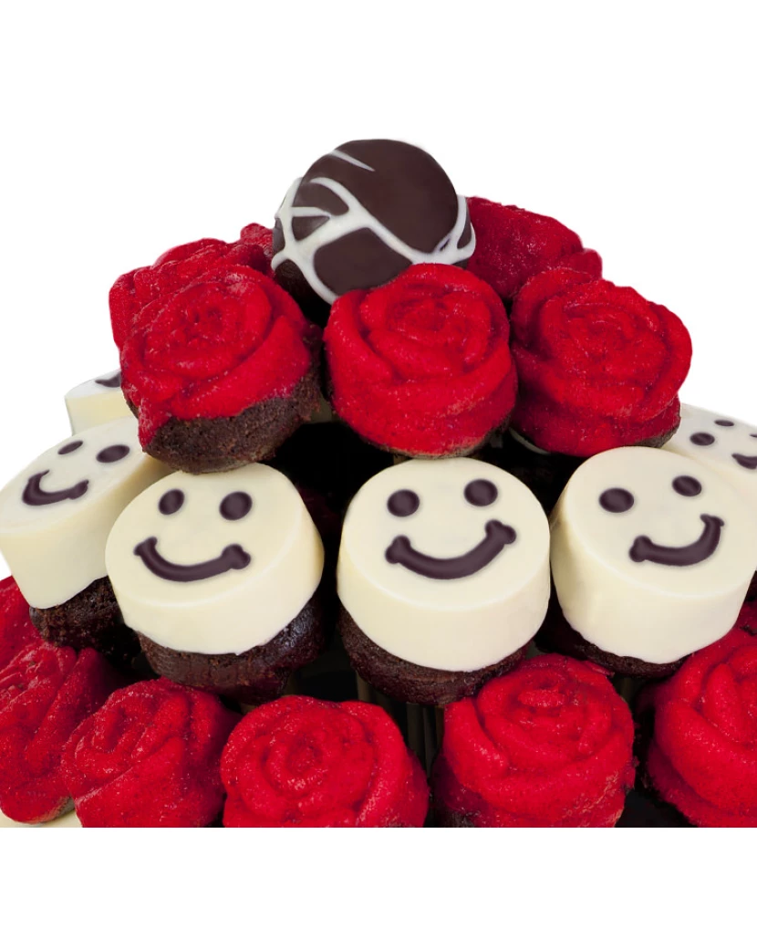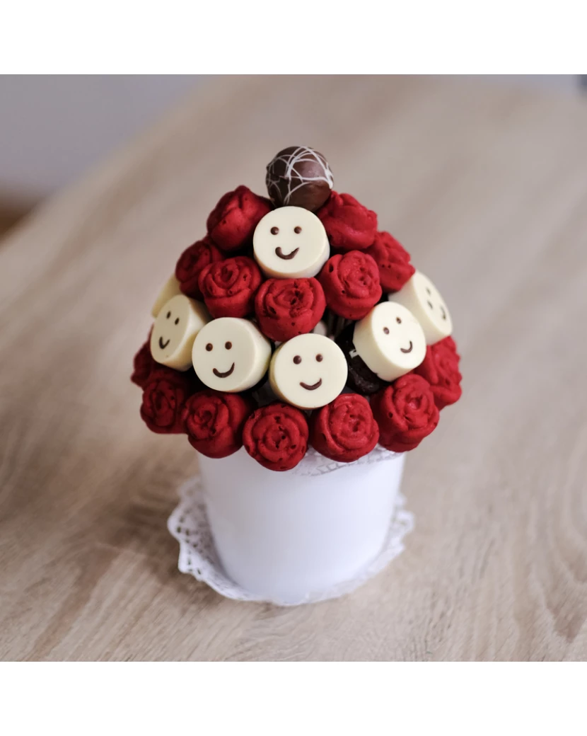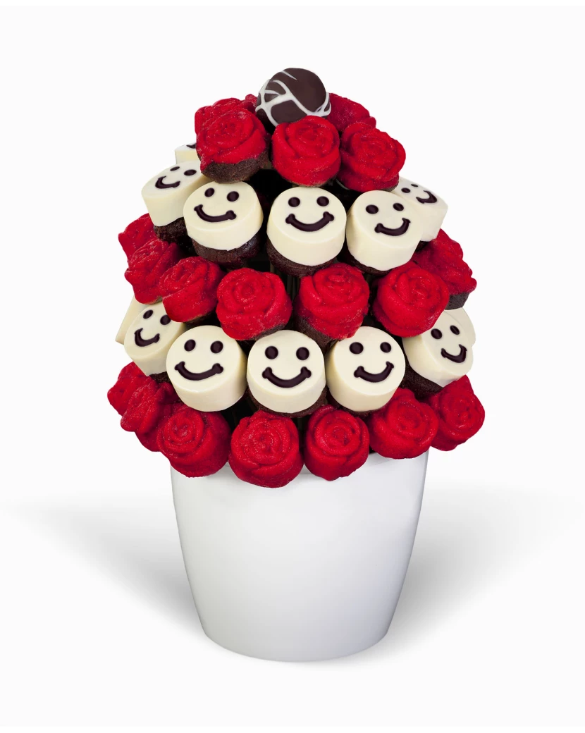Dárek pro kamaráda i kamarádku v podobě lahodné kytice Veselý pozdrav vykouzlí přátelům úsměv na rtu. Dortová kytice z čerstvě pečených červených muffinů ve tvaru růží a kulatých kakaových muffinů zdobených bílou belgickou čokoládou se smajlíky představuje veselý a netradiční přátelský pozdrav a dárek. Jedlou kytici můžete poslat přátelům jen tak pro radost či jako gratulaci k novému zaměstnání a popřát jim tak Hodně štěstí. Kytice z dortů se pečou těsně před doručením dárku kamarádovi či kamarádce a jsou vyráběny z kvalitních surovin. Muffiny jsou zdobené bílou belgickou čokoládou Callebaut a veselými obličeji, takzvanými smajlíky. Tuto veselou kytici můžete snadno objednat kamarádům odkudkoli a nechat ji doručit kurýrem kamkoli po celé České republice v dárkovém balení spolu s Vaším přátelským pozdravem napsaným do blahopřání ke kytici.