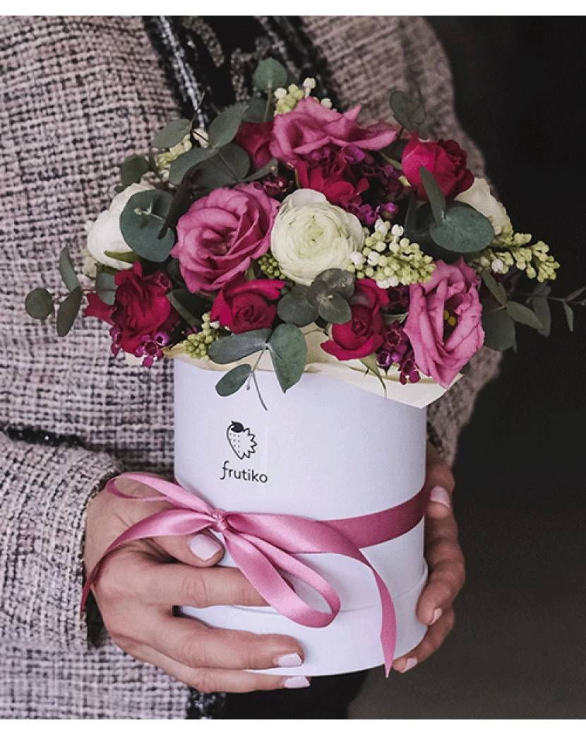 Květinový box s čerstvými květinami různých druhů ve vínové barvě obsahuje eustomy, pryskyřníky a trsové růžičky zdobené eukalyptem, waxem a matiolou. Tato bílá kulatá krabička není velká, má rozměry 15 cm na výšku a 13 cm průměr. Obsahuje zelenou floristickou hmotu, do které jsou napíchány čerstvé květiny, které při pravidelné zalívání vydrží čerstvé mnoho dní. Vínová/bordó barva květin působí velmi luxusně a zároveň decentně. Hodí se proto nejen jako dárek pro mladé dívky, ale také starší dámy. Pro ty obvykle vybíráme květiny v tlumených barvách. Bórdó barva květin nebývá velmi častá. Nejoblíbenější vínové květiny bývají magnolie a pivoňky. Pryskyřníky jsou pivoňkovým růžím velmi podobné a trsové růže v tmavě červené až vínové barvě jsou také velmi populární. Květinový box s čerstvými květinami doručíme jako dárek kamkoli po Česku.