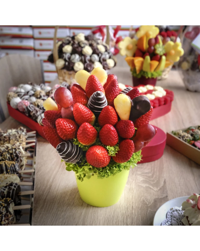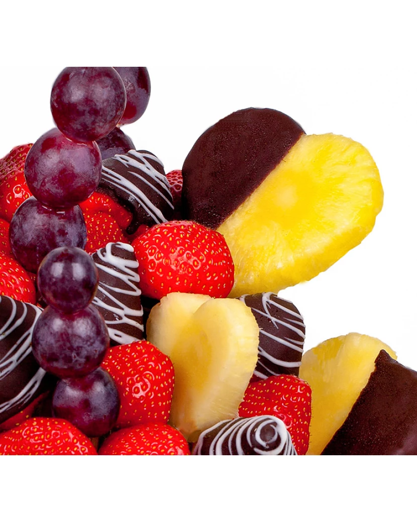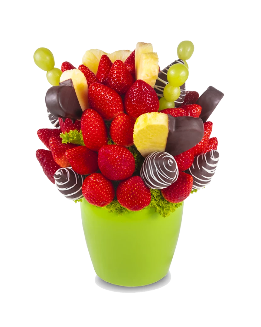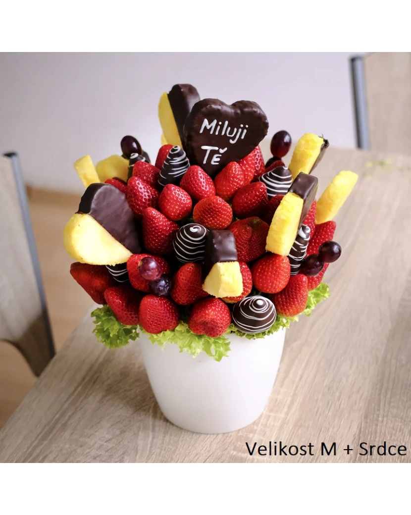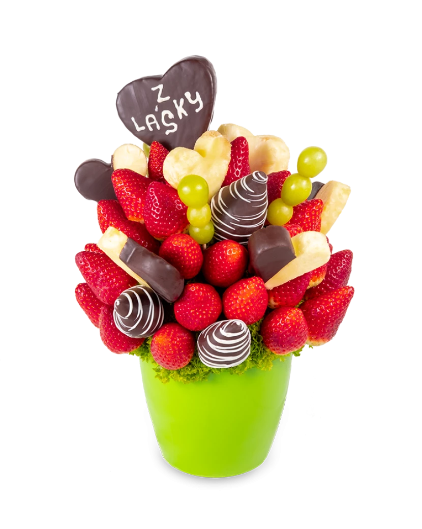 Ovocná květina Z lásky představuje originální a výjimečný způsob jak říci "Miluji Tě"! Tento netradiční dárek z lásky v podobě krásné a chutné kytice z ovoce představuje perfektní dárek k Valentýnu, výročí, narozeninám i jen tak jako pozornost z lásky pro vaše milované. Tato kytice je vytvořená z ananasových srdíček, čerstvých jahod v čokoládě a sladkých hroznů. Pokud hledáte z lásky dárek pro muže doporučujeme Vám velmi oblíbené kytice z klobás a sýrů.