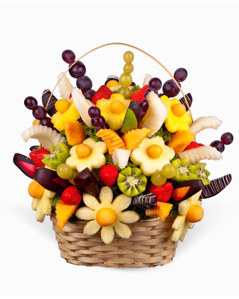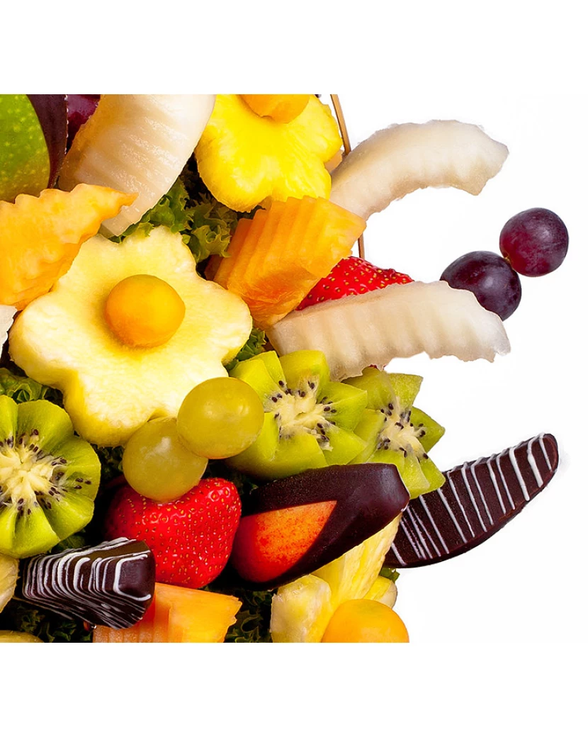 Na velké společenské akce se také hodí kytice s názvem Svatební kytice, což je veliká kytice z ovoce a čokolády, skvělá jako dekorace na svatbu i jinou událost. A do třetice těch největších a nejslavnostnějších nabízíme Ovocný koš Frutiko.