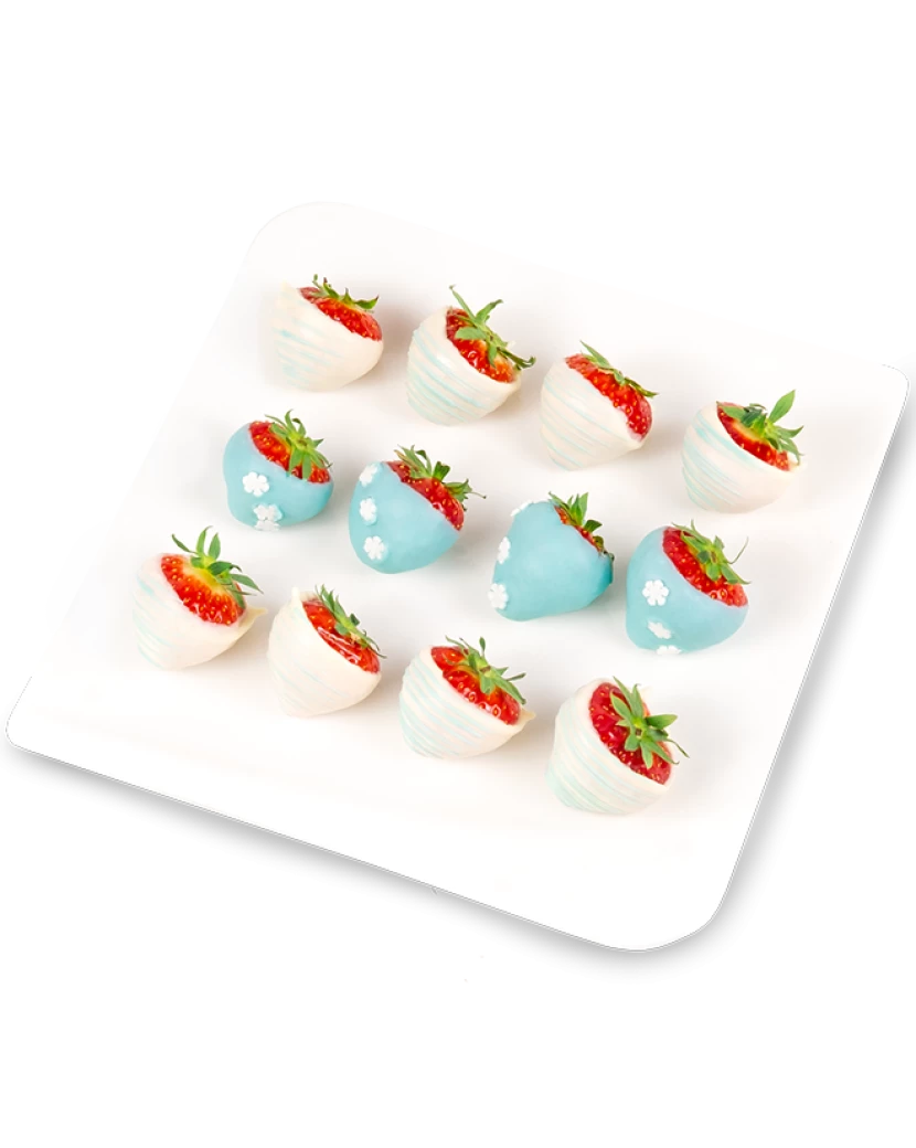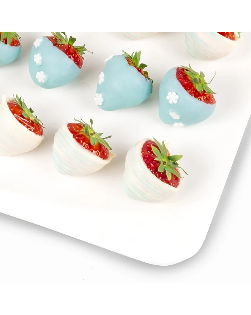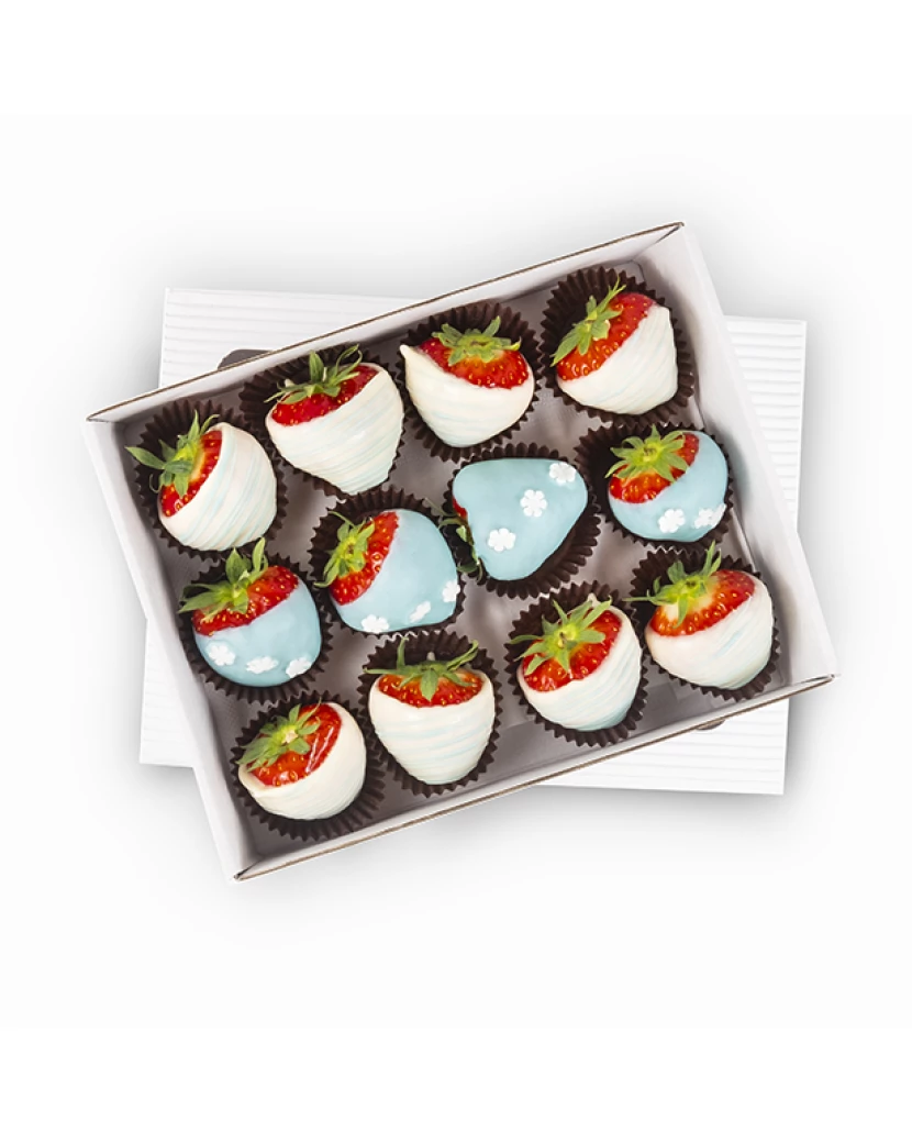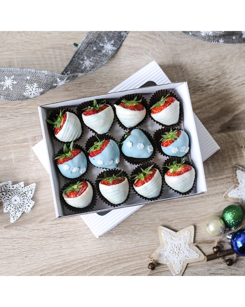 Jahody v bílé a modré čokoládě s čokoládovými vločkami v elegantní bonboniéře jsou skvělým dárkem k Vánocům či Mikuláši. Dárková bonboniéra Frutiko s jahodami v čokoládě potěší všechny milovníky belgické čokolády. Jahody jsou namočené v bílé a barevné (modré) belgické čokoládě Callebaut. Kombinace jahod a čokolády je oblíbená u mužů i žen jako dárek anebo jen tak pro radost.