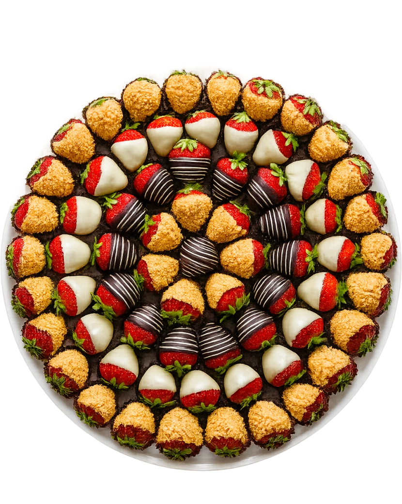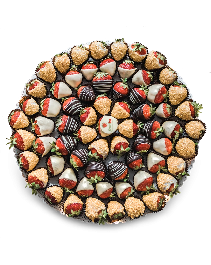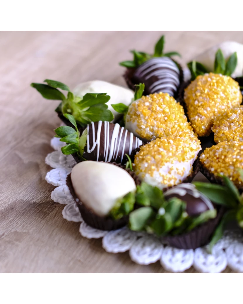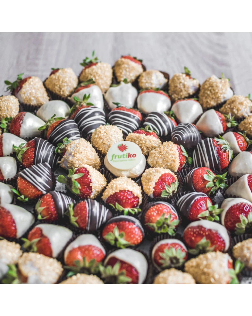 Tento tác je plný čerstvých jahod zdobených v bílé, tmavé a karamelové čokoládě. Některé jahody jsou zdobené ještě oříšky a některé jedlým zlatým popraškem. Tác se zlatými čokoládovými jahodami je skvělým občerstvením nejen na svatby ale jakékoli společenské akce. Zlaté jahody se také hodí na zakousnutí k šampaňskému nebo welcome drinku. Doručíme chlazené a dárkově balené kamkoli po ČR.